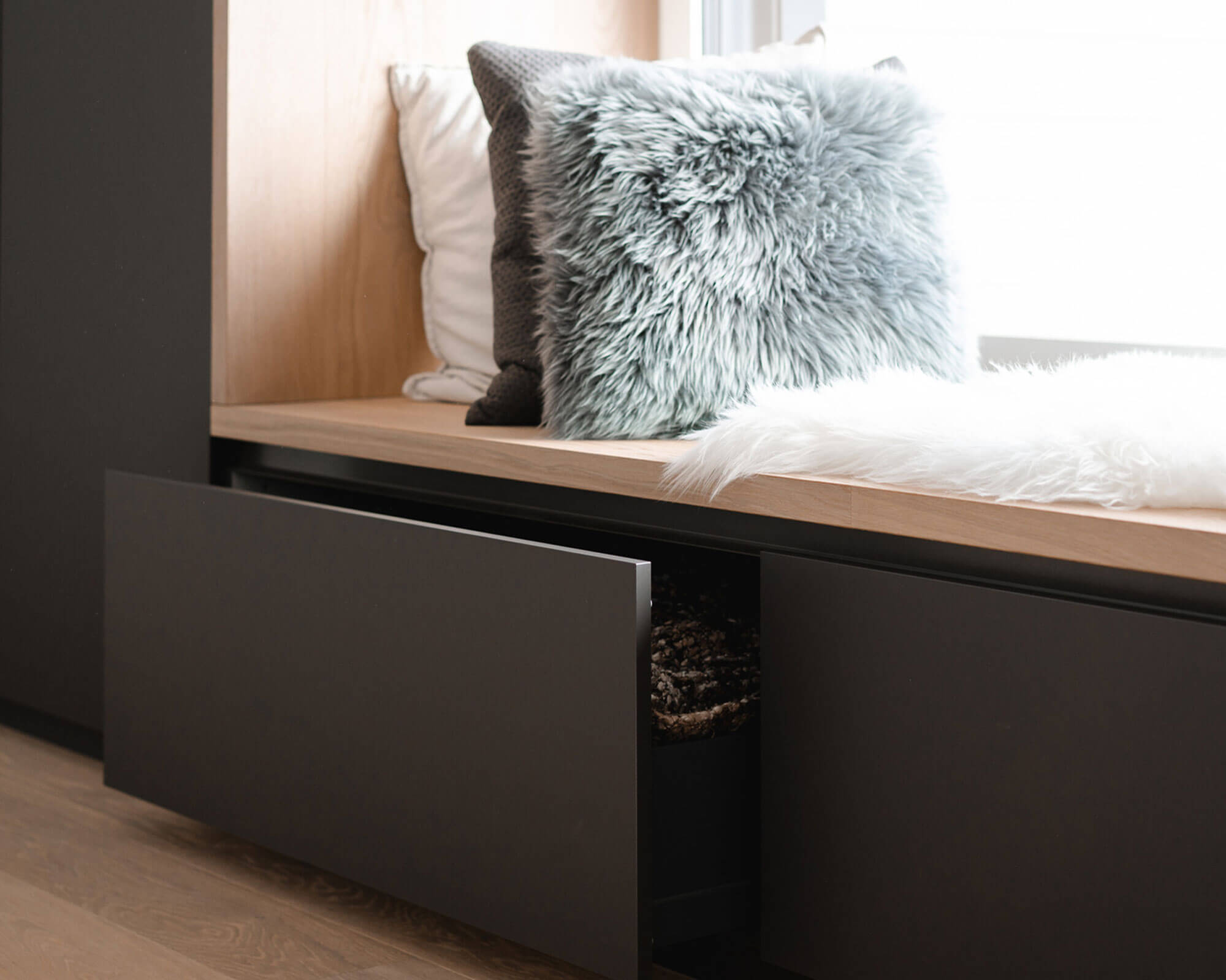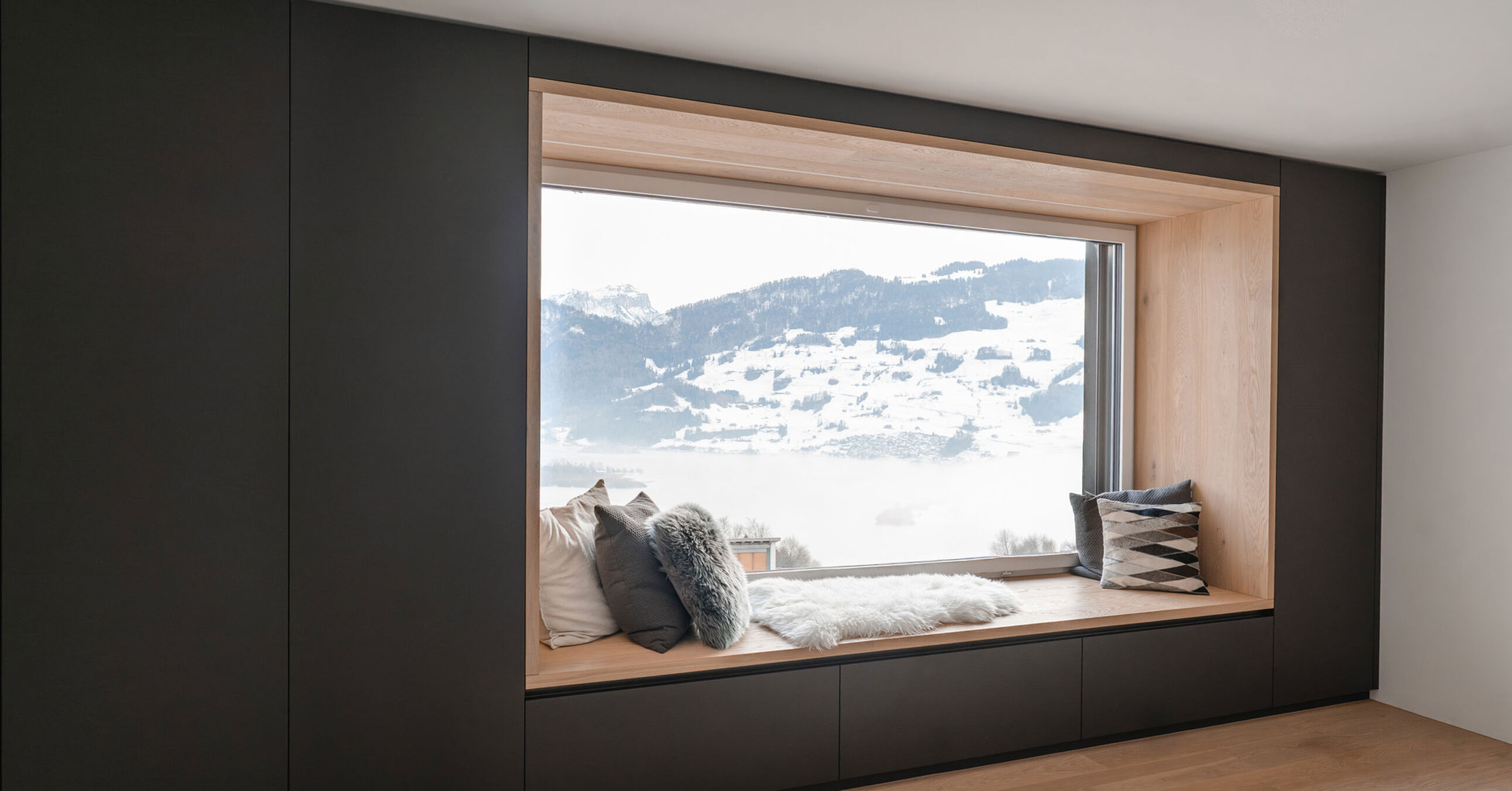 Exterior parts in Supermatt Fenix Zinnia, alcove and bench covered with parquet flooring |