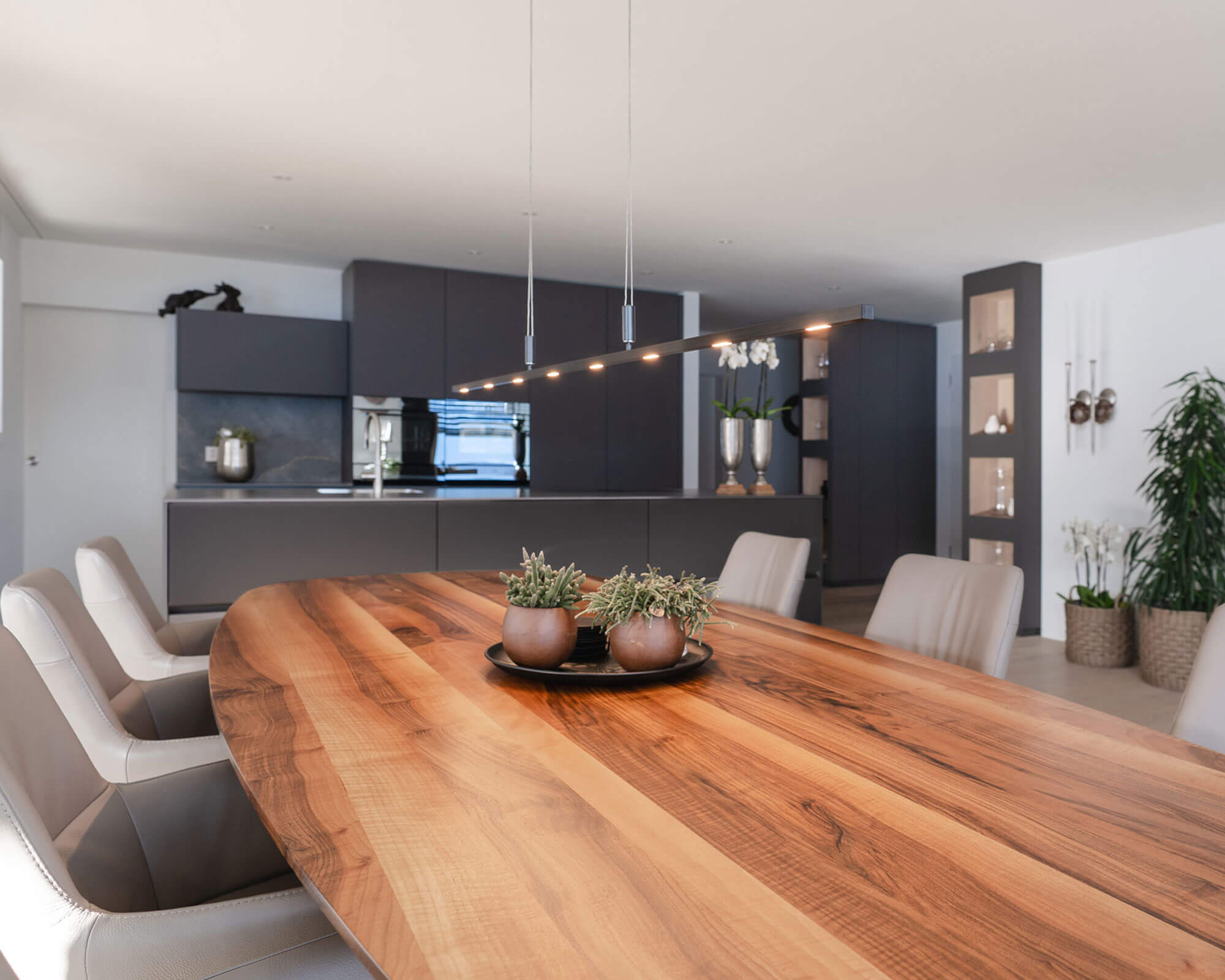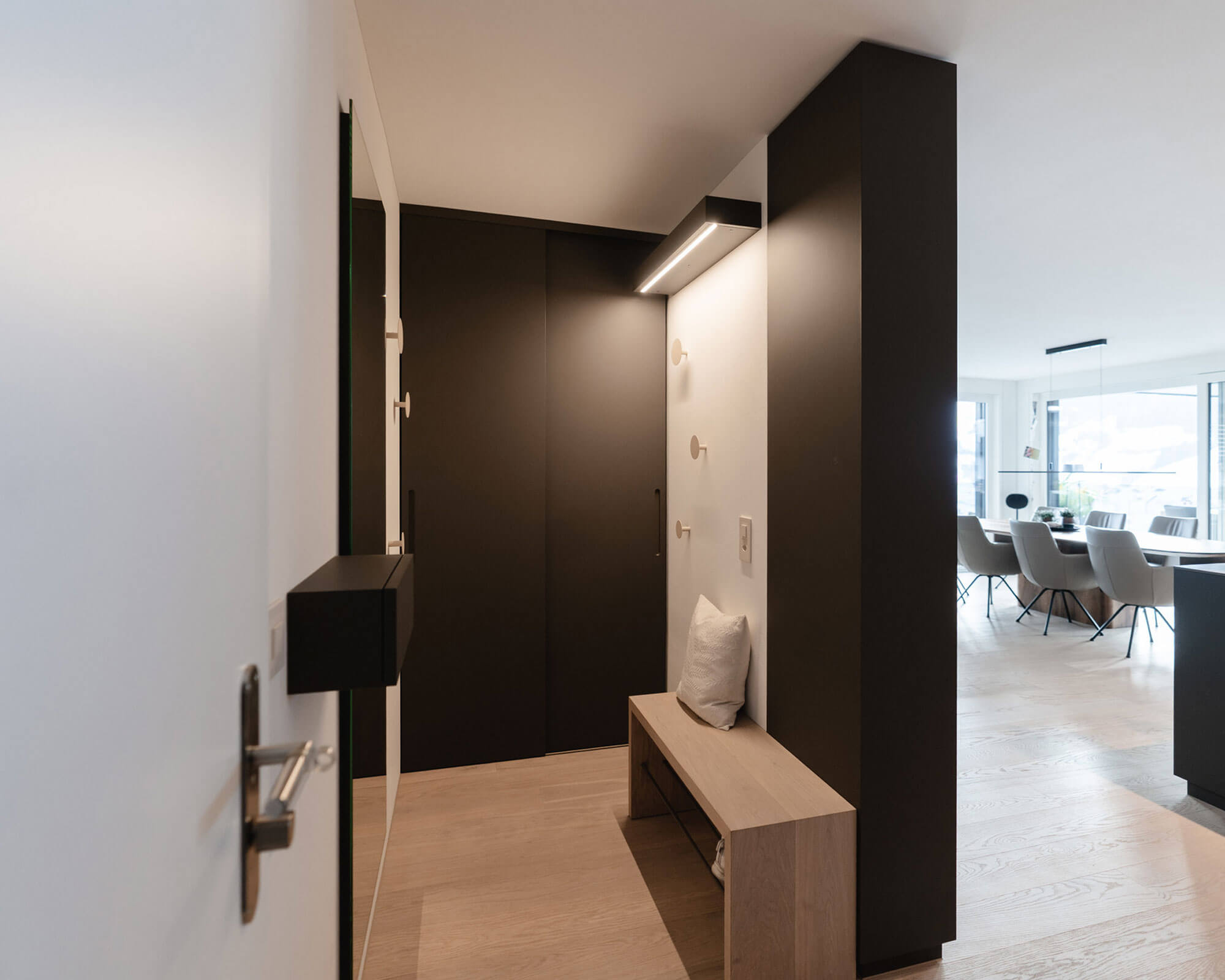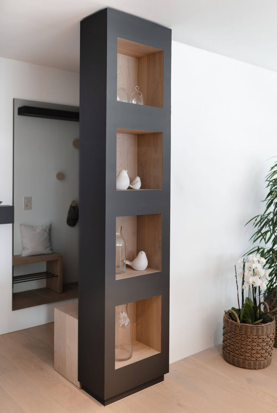 Exterior parts in Supermatt Fenix Zinnia, niche clad with parquet flooring |